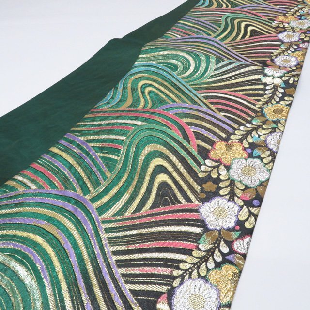 - ★きもの北條★ 振袖用 花模様 辻が花模様 波文 箔糸 六通 仕立て上がり 中古 正絹 袋帯 T797-15
