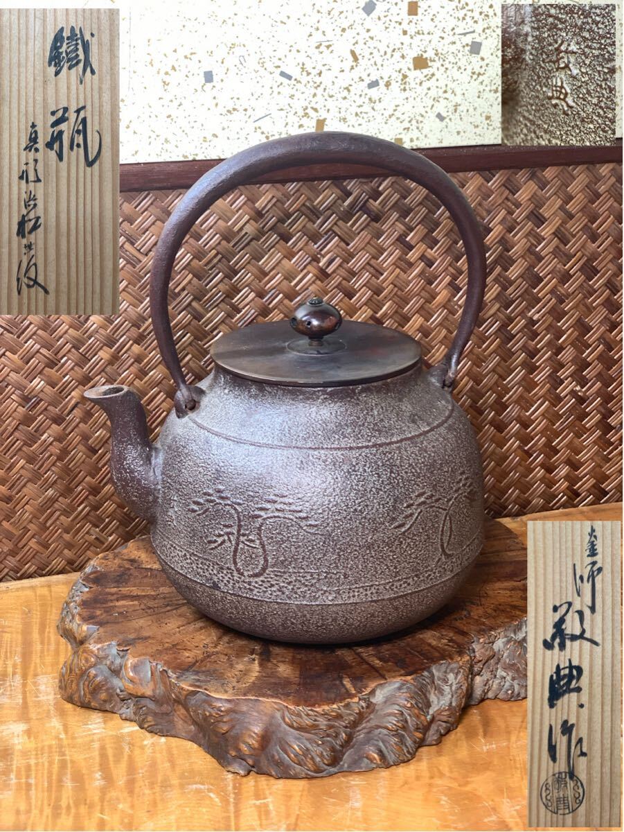 - 時代物 煎茶道具 人間国宝 高橋敬典 作 真形 浜松地紋 鉄瓶 共箱 在銘 良品 銅蓋 茶器 茶道具 湯沸 工芸品 骨董 古玩 古道具 和骨董 和美術