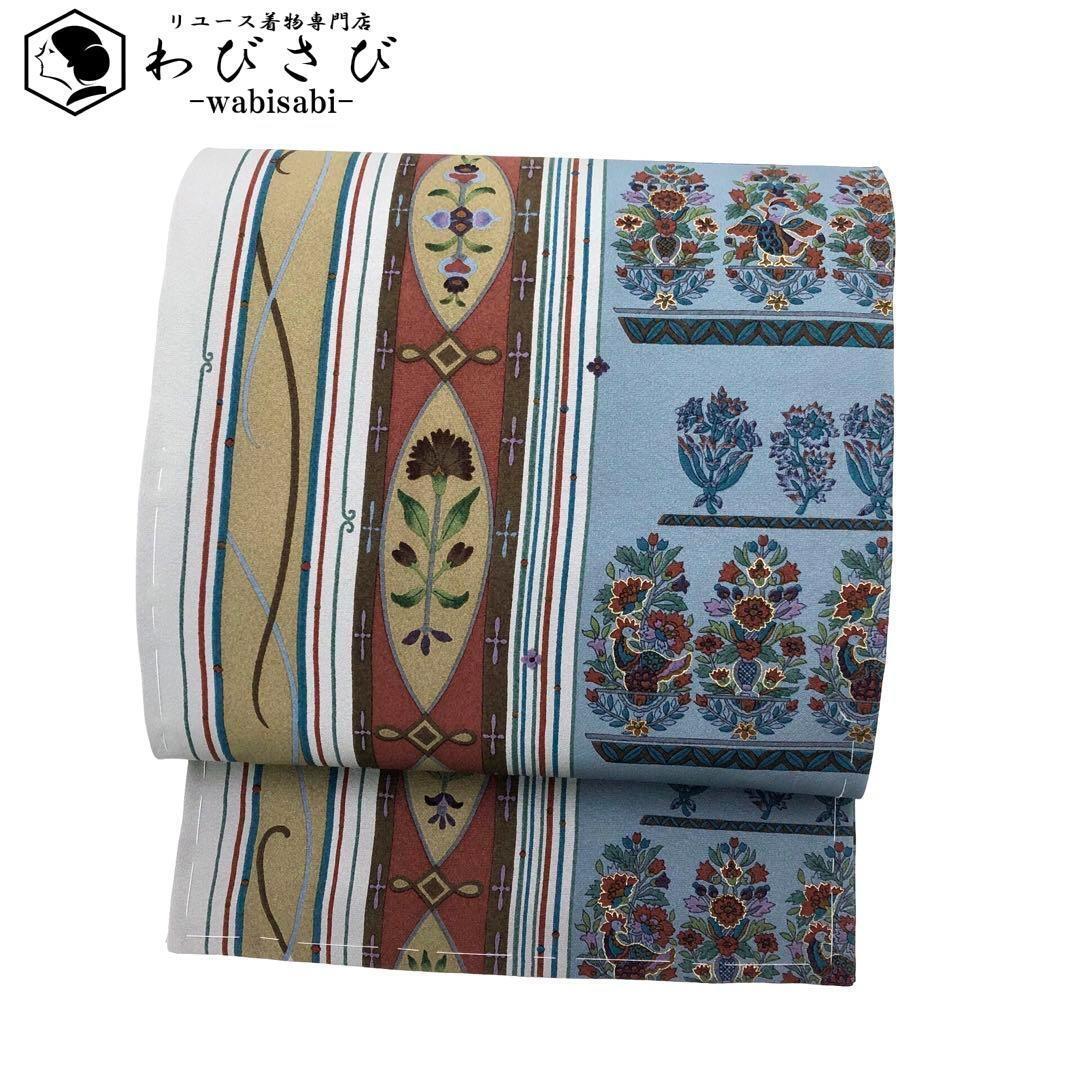 - 名古屋帯 総柄縦花模様金彩 縮緬 薄鈍色 O-3610 着物 きもの kimono 和服 和装 中古 リサイクル着物 【送料無料】