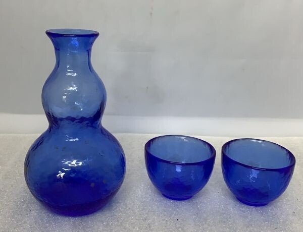 - B1004→瓢箪形 徳利 酒器 冷酒 硝子 ガラス 青 ブルー 夫婦 ペア 酒器セット 中古