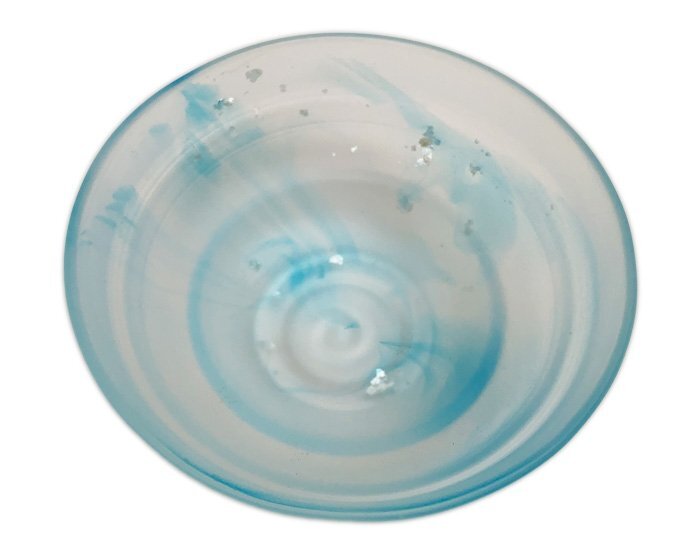- 木箱入り 銘 関吉昭 硝子茶碗 平茶碗 夏茶碗 近代工芸 現代作家 現代陶人 焼き物 工芸 硝子 青色 美術品 芸術品 共箱