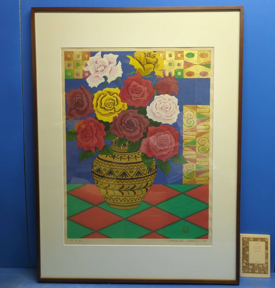 - kankando【関野洋作 木版画 15号大 瓶花(薔薇) 限80 サインと落款 額装】関野凖一郎次男《真作》
