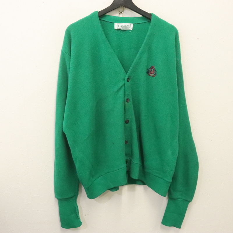> T142 90sビンテージ IZOD アクリルニットカーディガン USA製■1990年代製 表記XLサイズ グリーン 刺繍 アメカジ ストリート 古着 古着卸