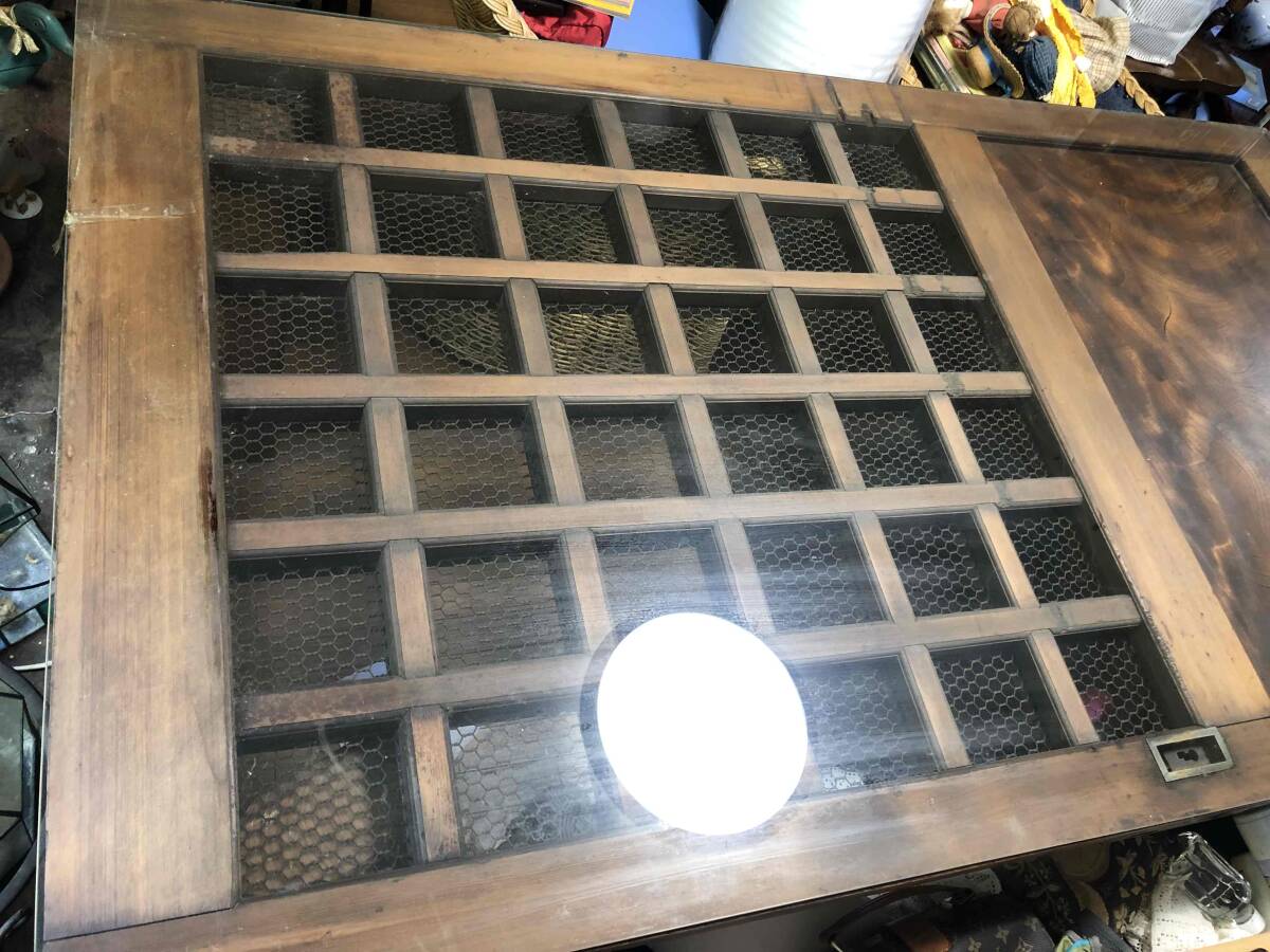- 【古民家再生×和モダン】蔵戸テーブル 古材リメイク ガラス天板付き アンティーク家具 和風テーブル 古道具【直接引き取り限定】
