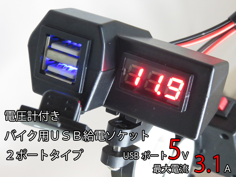 > バイク用 USBソケット DC5V 3.1A USB2ポート 防水キャップ付 電圧計付 USB充電給電 ハンドル装着 Goproドラレコ スマホ充電