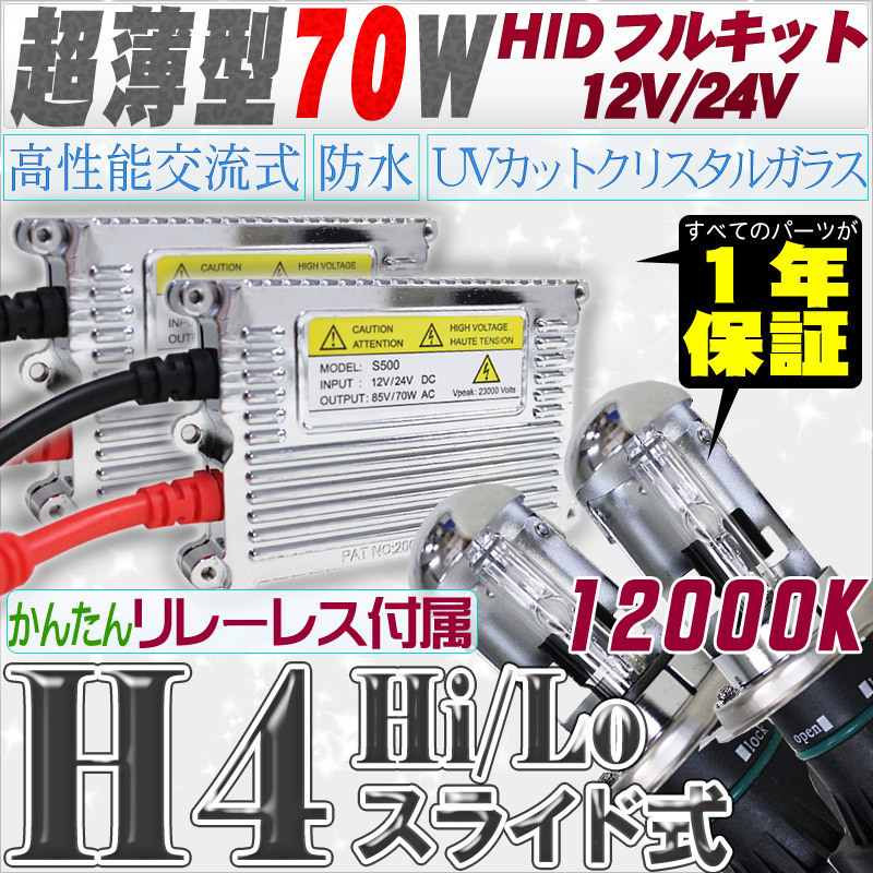 - 高性能 薄型HIDキット 70W H4 Hi/Lo スライド式 リレーレス付 12000K 12V/24V 【交流式バラスト&クリスタルガラスバーナー】
