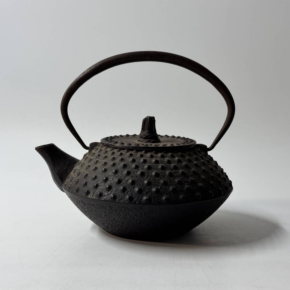 - 【63924Q】鉄器 鉄瓶 平あられ 刻銘在 判読不明 湯沸 煎茶道具 鋳鉄 鋳物 茶の湯 重量1.25kg 経年保管品 現状品