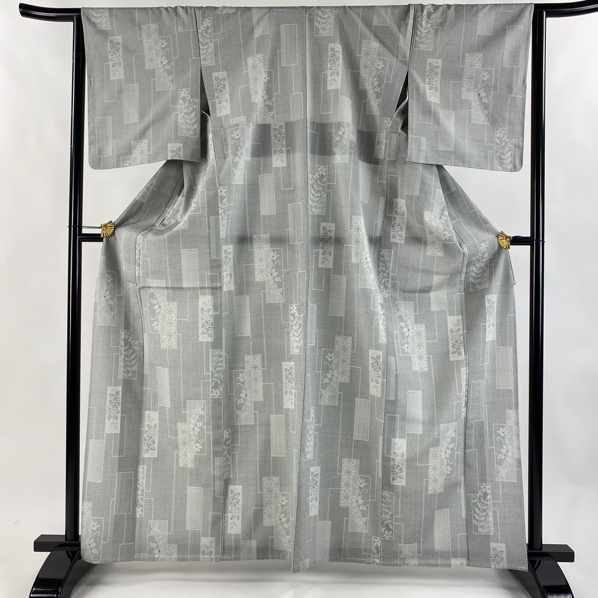 - 【美品】 塩沢紬 身丈163.5cm 裄丈63.5cm S 単衣 塩沢絣 雪塩沢 証紙 短冊 草花 青灰色 正絹 名品 【中古】