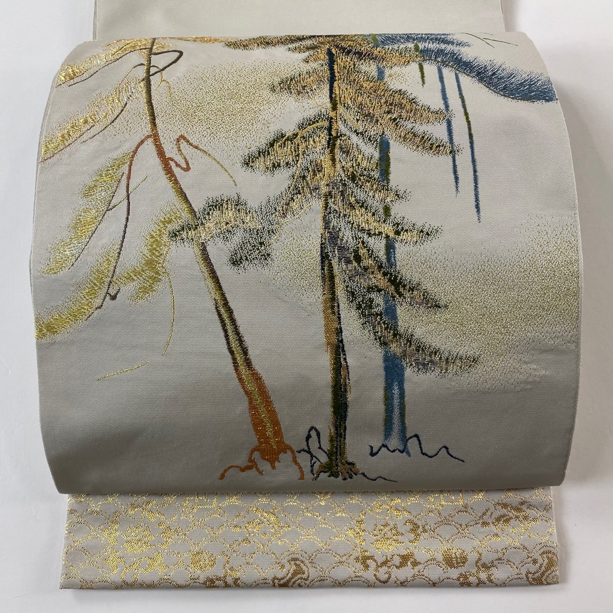 - 袋帯 逸品 龍村平蔵 落款 水墨名松文 金糸 箔 灰白 お太鼓柄 正絹 【中古】