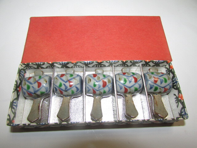 - (会津若松・旧家・蔵出し)昭和レトロ( 古い味わいのある箸置き5個・色絵打ち出の小槌形 )未使用・貴重・珍品