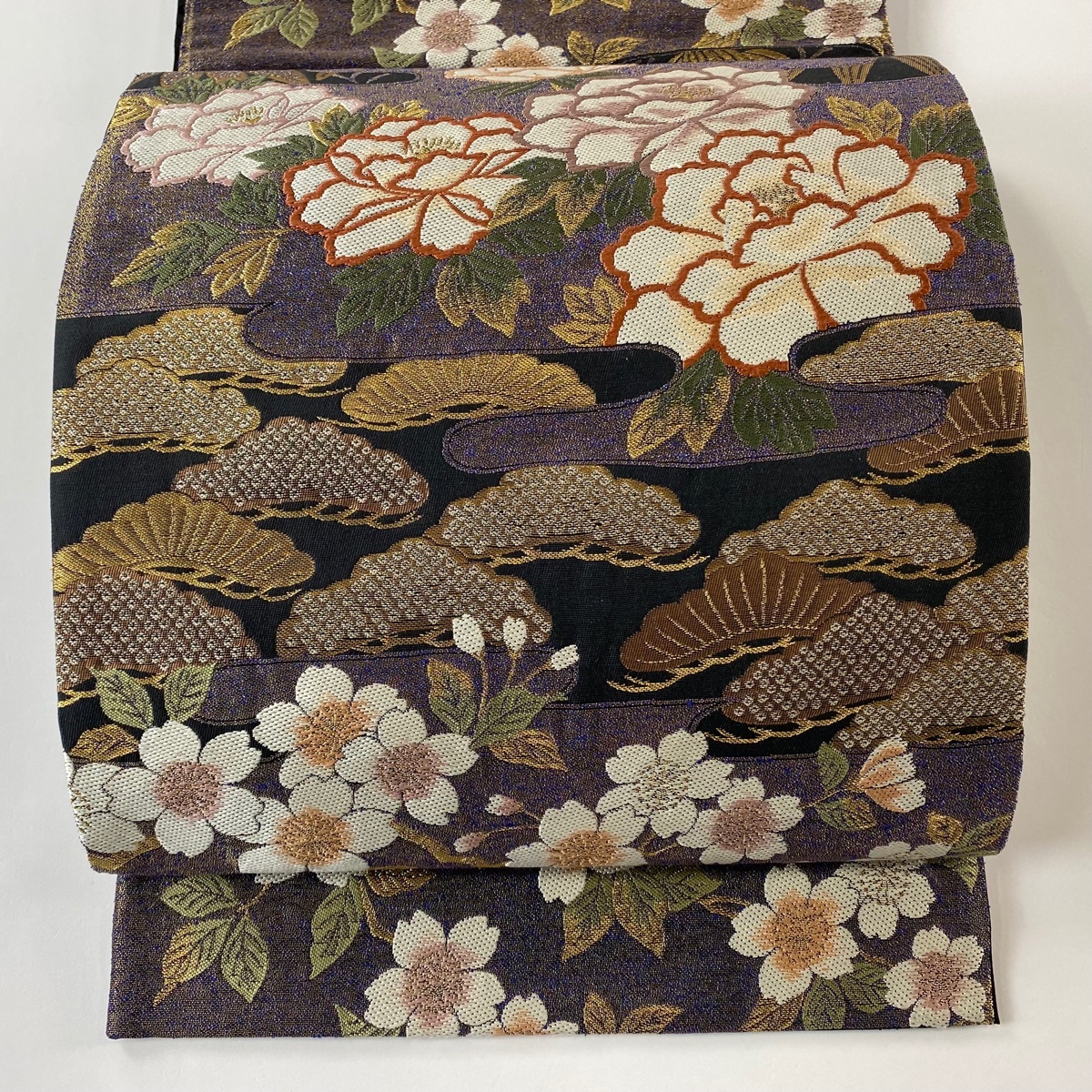 - 【美品】 袋帯 秀品 笠松 牡丹 箔 焦茶色 六通 正絹 【中古】