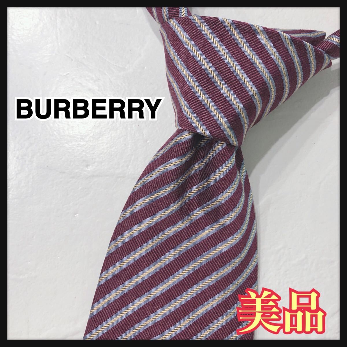 > ☆美品☆ BURBERRY バーバリー ネクタイ ボルドー シルク ストライプ スーツ フォーマル メンズ 男性 紳士 送料無料