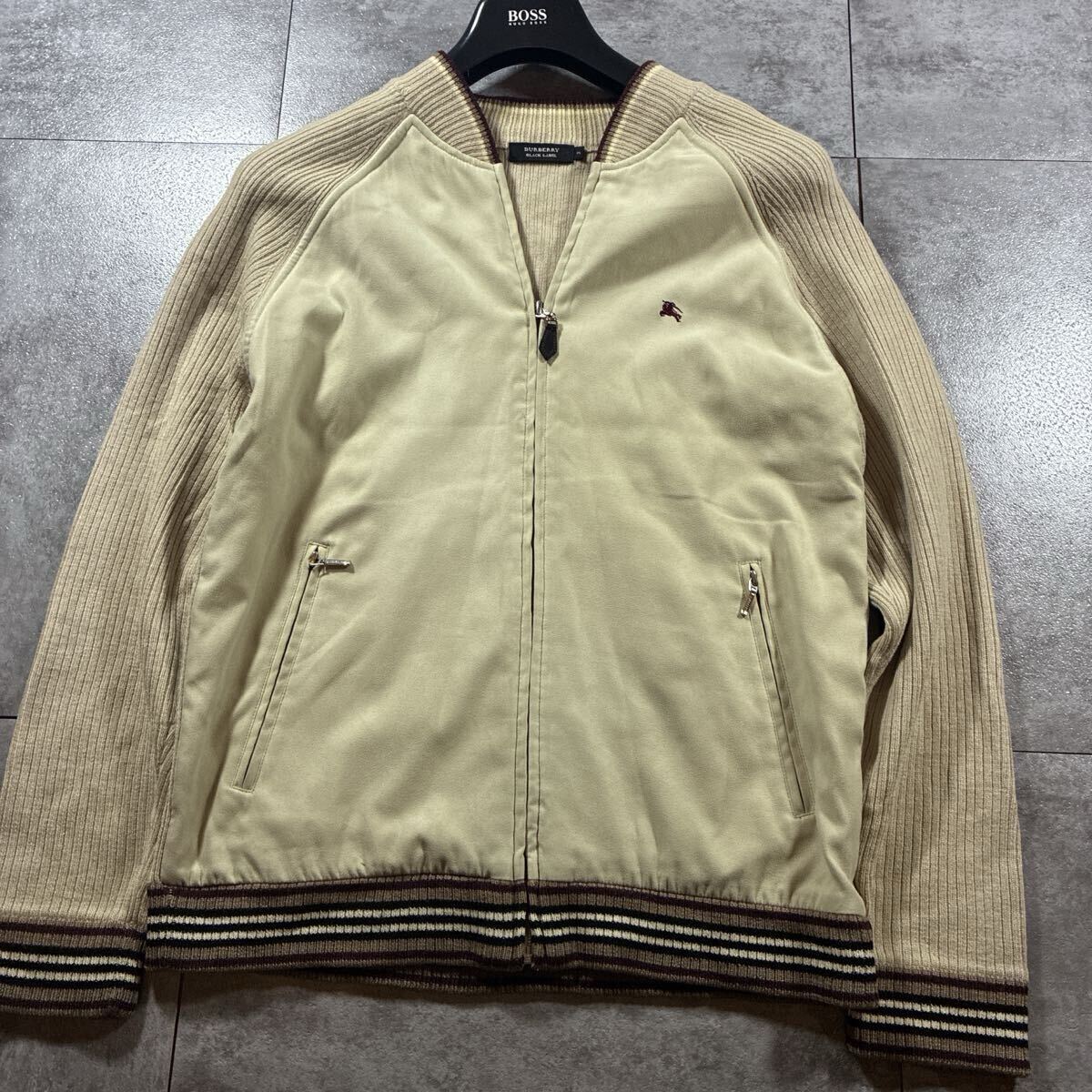 > 【美品・L相当】BURBERRY BLACK LABEL バーバリーブラックレーベル ウール ジップ ブルゾン ニット ベージュ リブ袖 メンズ スウェード切替