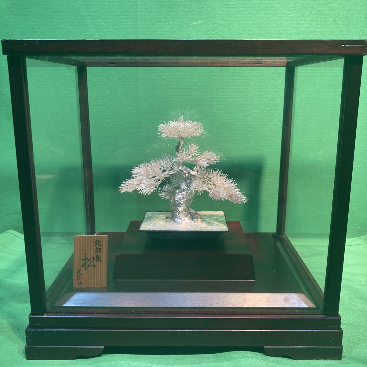 - 純銀製 松 盆栽 銀細工 純銀 金属工芸 光則作 インテリア 置物 ガラスケース付 中古品