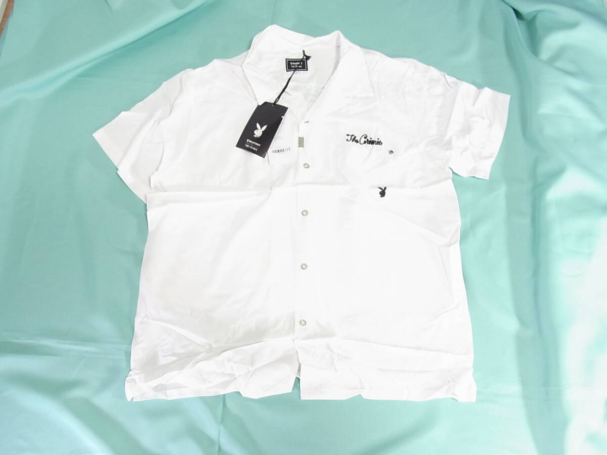 > < 新品未使用 コラボ PLAYBOY by THE CRIMIE プリント 半袖シャツ XLサイズ 白 プレイボーイ ブランド クライミー レーヨン