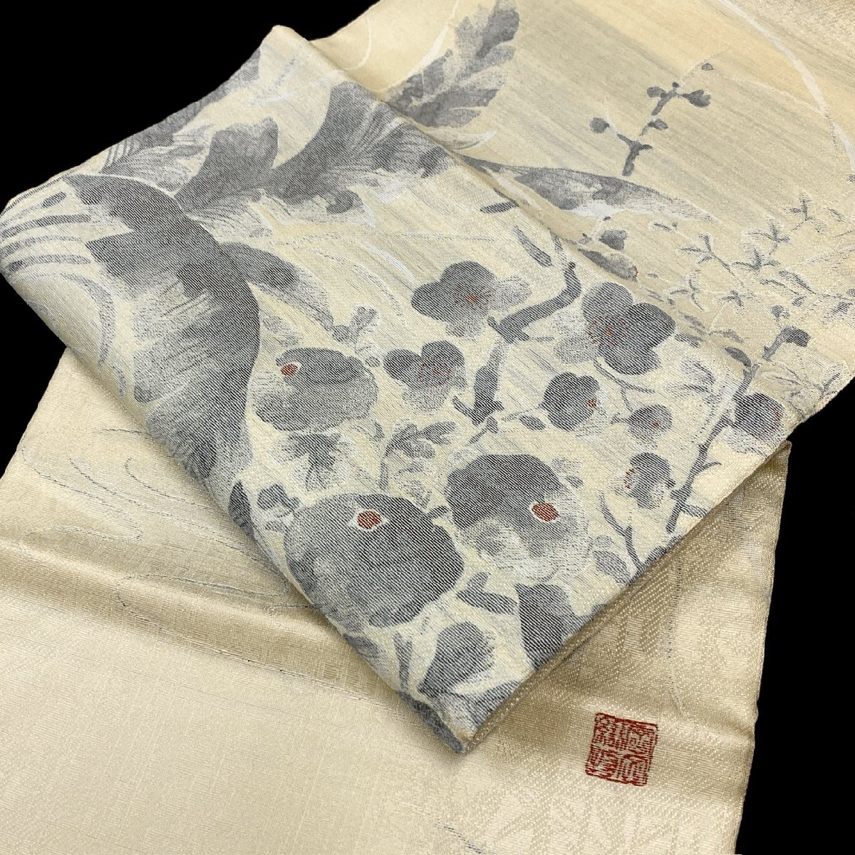 - 着物月花 岡文織物 六文字屋半兵衛 墨彩 品のある花 袋帯 未使用品 お太鼓柄 正絹 西陣織物 ob7183