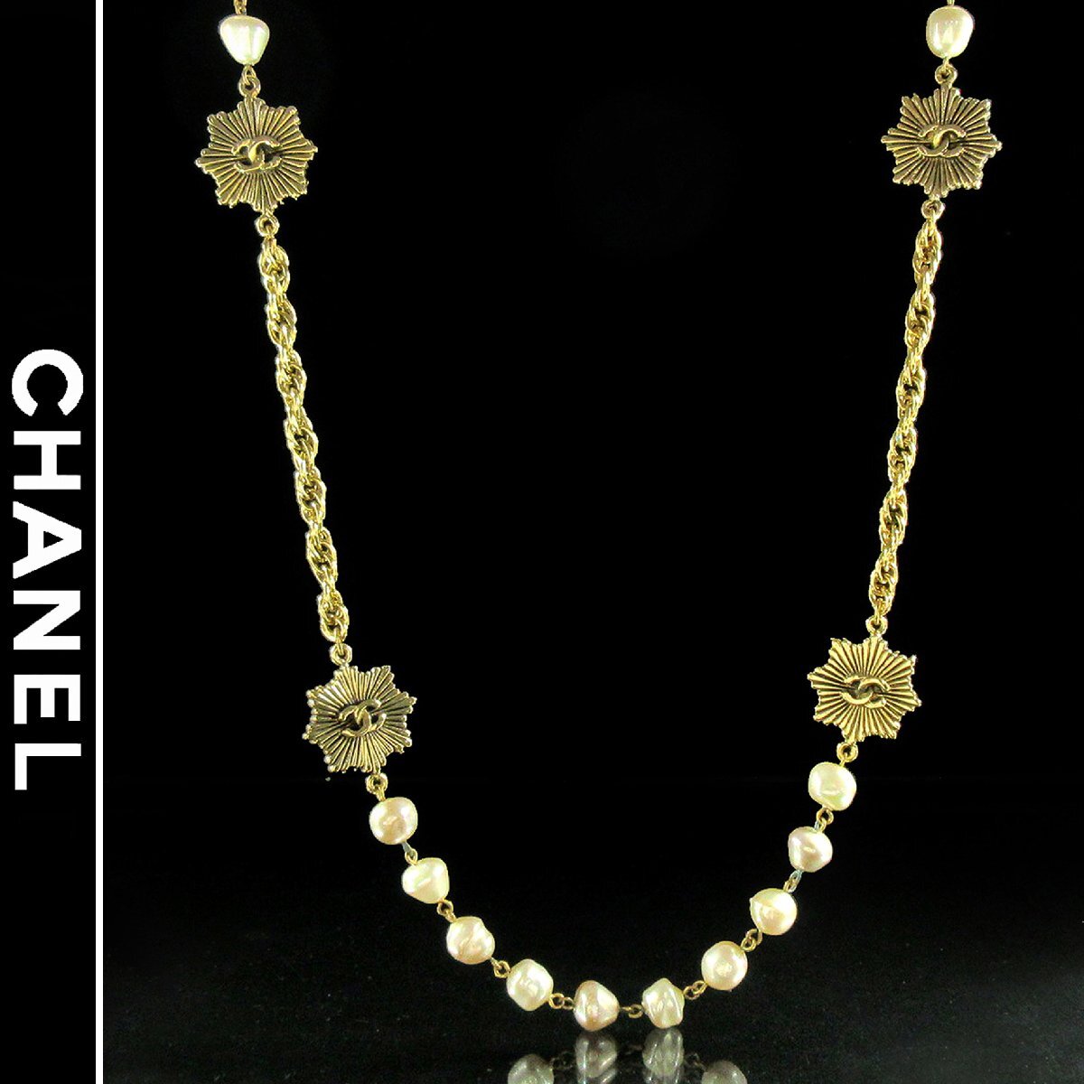 > シャネル 1984年 ヴィンテージ ココマーク フェイクパール デザイン ロング ネックレス 長さ99.5cm ゴールド 箱付 CJ7