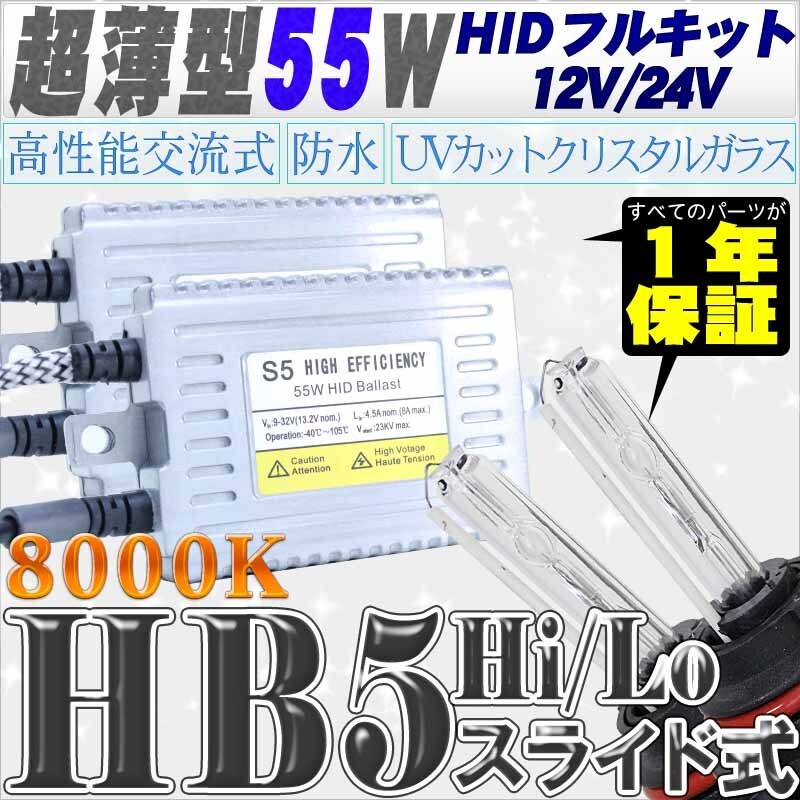> 高性能 薄型HIDキット 55W HB5 Hi/Lo スライド式 リレー付 8000K 12V/24V 【交流式バラスト&クリスタルガラスバーナー】