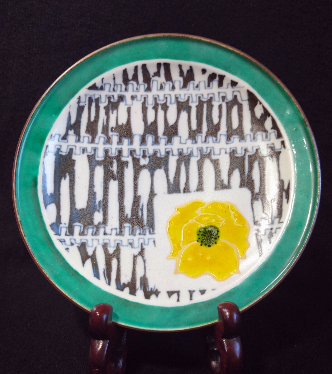 > 松本佐一 染付 色絵 幾何学文 花文 松葉文 18cm 中皿 松屋窯 九谷焼 県無形文化財保持者 b-57a4608-cee