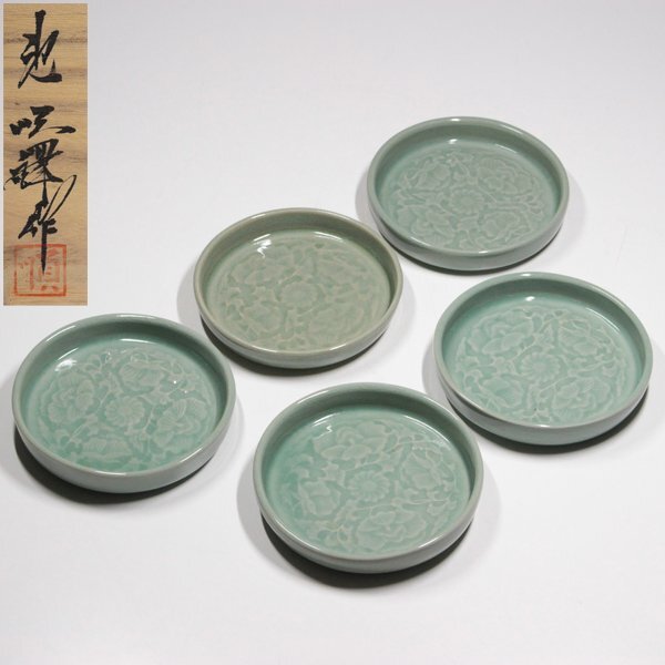 > 【TAKIYA】8040 池順鐸 『青磁刻花皿五客』 窯変 共箱 茶道具 高麗 浅川伯教 柳海剛 韓国人間文化財(人間国宝)