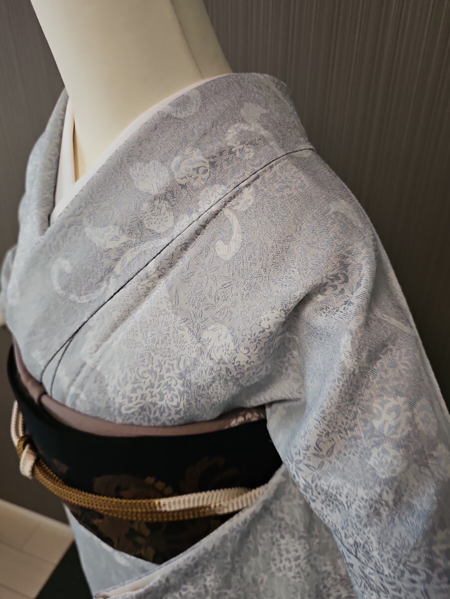- すずや■605【袷】正絹お召し 裄丈68.5 着丈162cm ブルーグレー系
