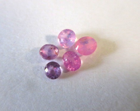 明るいピンクや紫味のあるピンク、シルキーピンク、ミルキーピンク、少しずつ色味の違うピンク・サファイアです。インクルージョンがありますが、透明感とテリがあります。非加熱。
