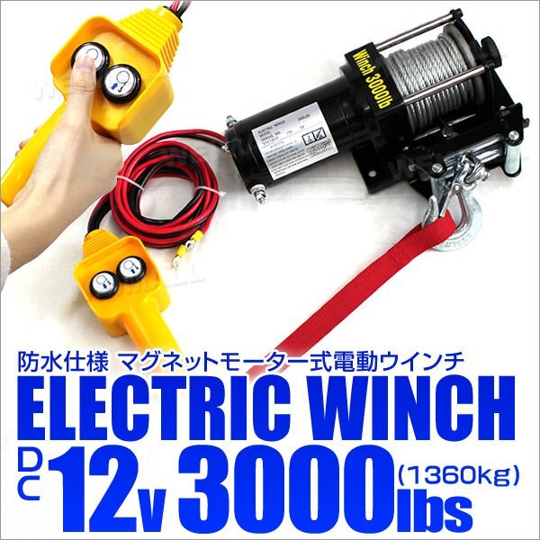 > 電動ウインチ 最大牽引 3000LBS 1361kg DC12V 防水仕様 付属品フルセット マグネットモーター 電動 引き上げ 牽引 ホイスト クレーン