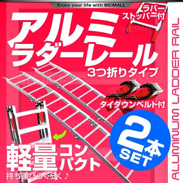 - 【2本セット】バイクレール 三つ折り 脱輪防止壁 ベルト付 アルミラダーレール 歩み板 折り畳み 幅広 ブリッジ スロープ 車両 運搬 積込み
