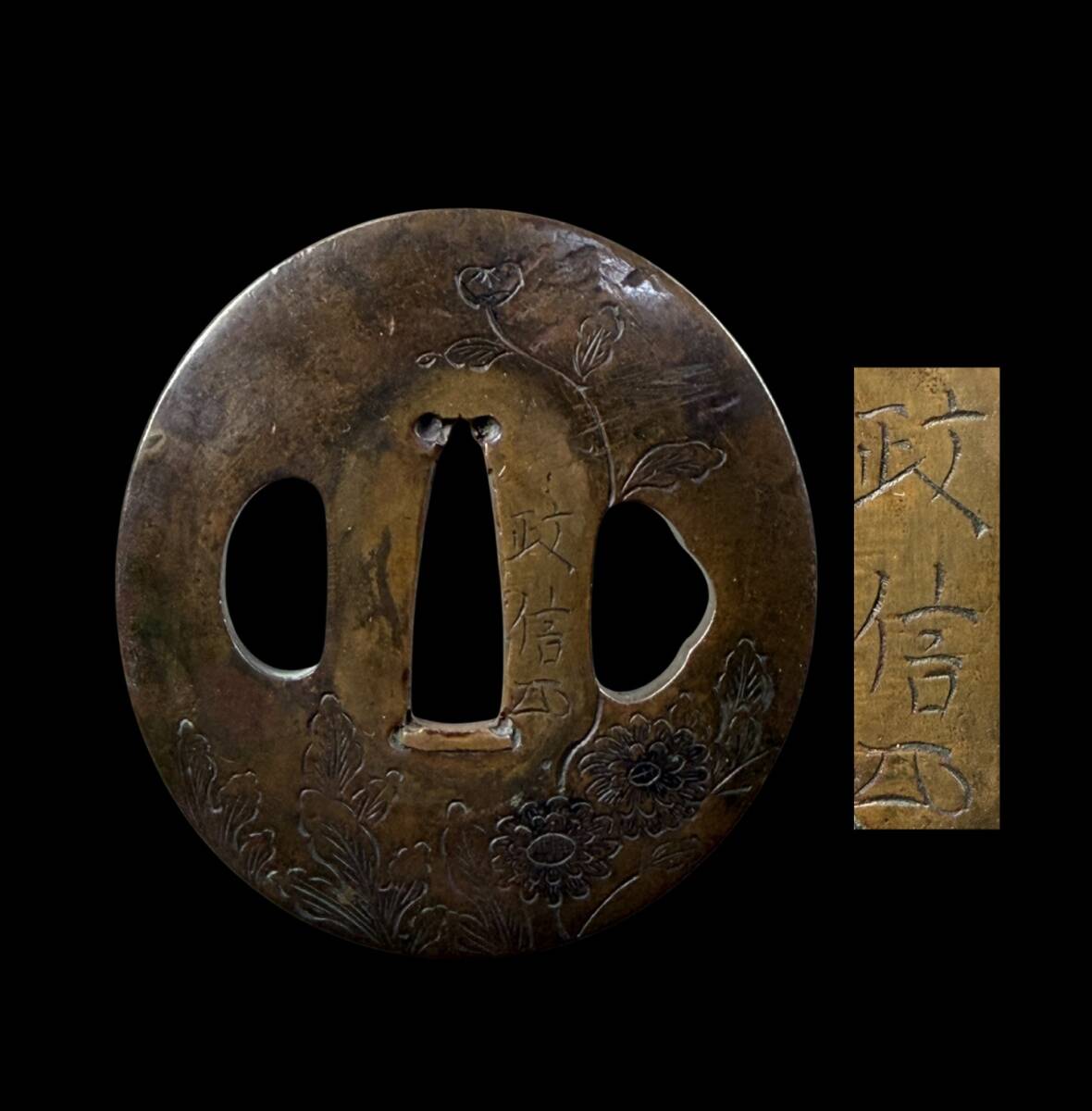 > 【偲】政信在銘 銅地鐔 細工 鍔 つば 居合用 日本刀装具 直径約6.3cm 重さ約119.38g r-937