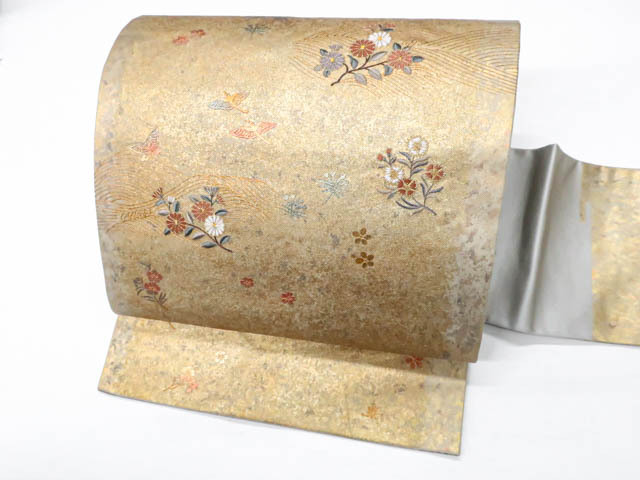 - 《古美術京松》リサイクル着物 九寸名古屋帯 昭和レトロ 太鼓柄 金糸 花 蝶 正絹 kyo7b08-170