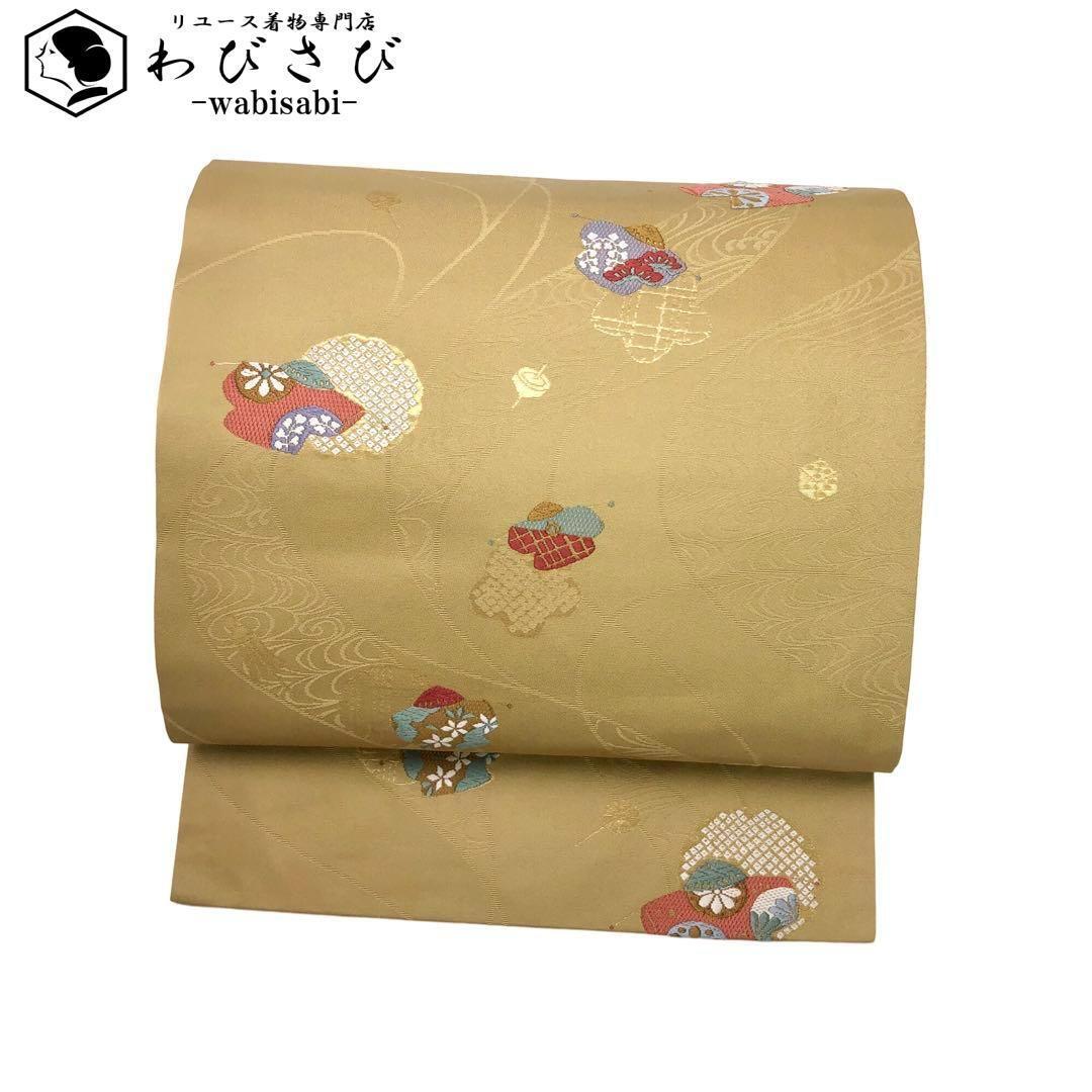 - 名古屋帯 案山子 かかし 雪輪 流水 花柄 麦藁色 O-2611 着物 きもの kimono 和服 和装 中古 リサイクル着物 【送料無料】