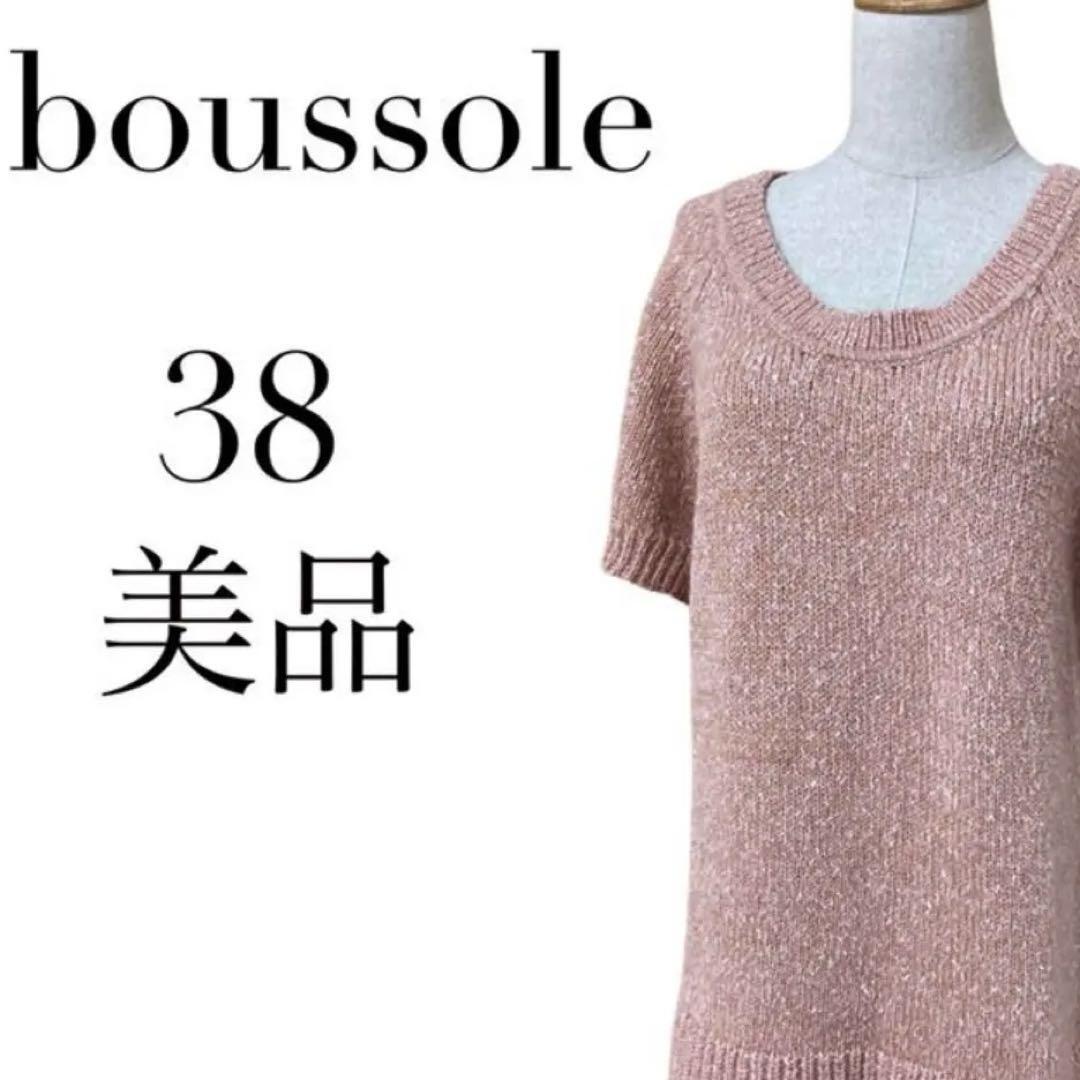 - T美品 ブソル boussole 丸首半袖ニット 上質生地モヘア混 ラメ ツイード ピンク 38 M