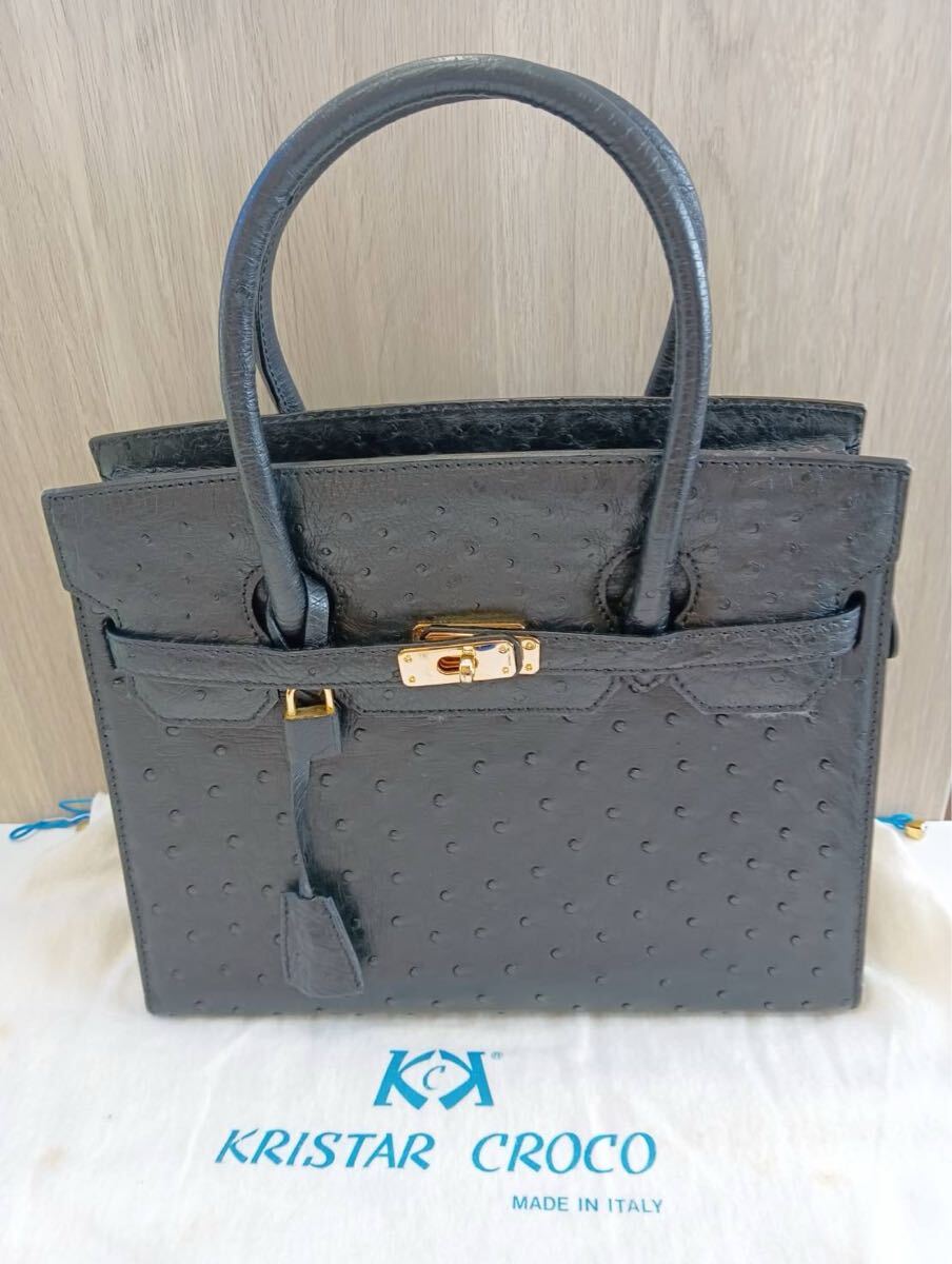 - 【中古品】オーストリッチ ゴールド金具付き ハンドバッグ 黒ブラック 手提げ バッグかばん 保存袋付き 現状品