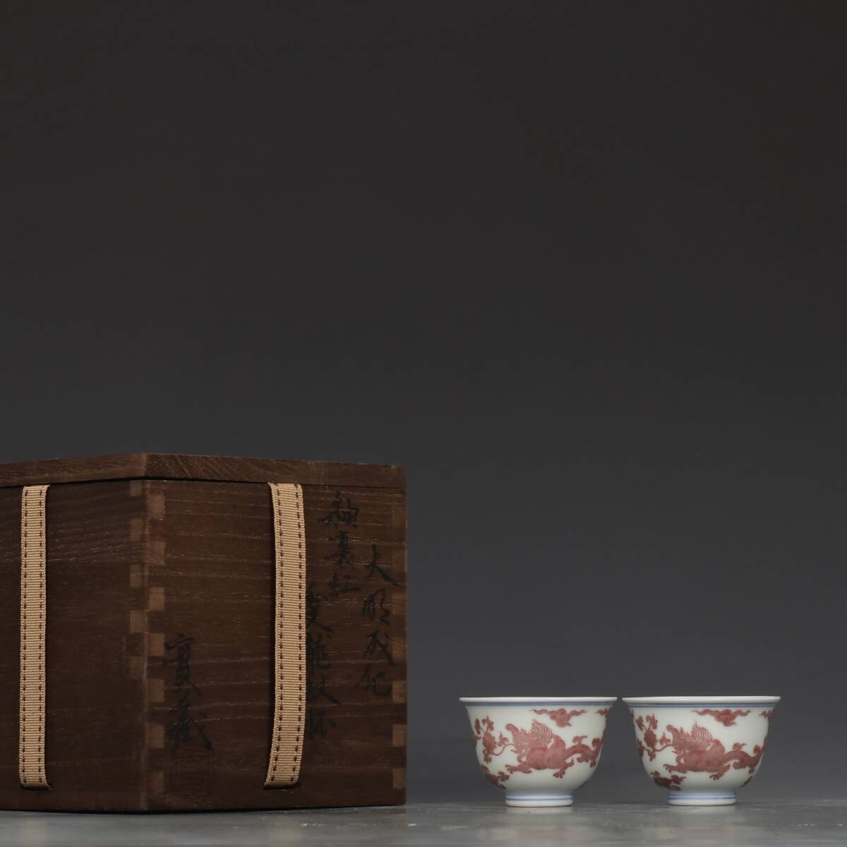- 明時代 成化 釉里紅 龍文杯2客 唐物 箱付き 陶磁器 中国美術 古美術 置物 骨董品 高さ4cm 口径6cm RG1178