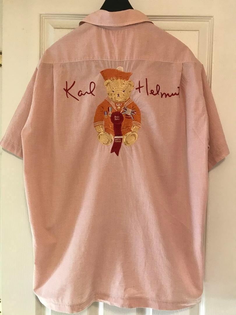 - カールヘルム ピンクギンガムチェック 後身頃に熊刺繍 ハマ・カラ- 半袖シャツ