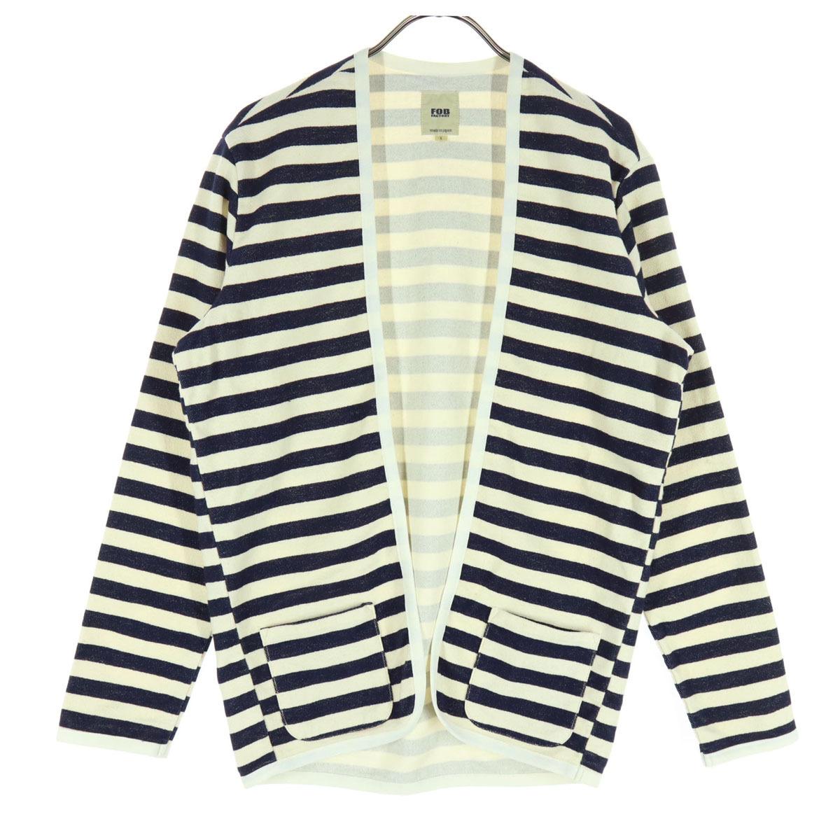 > 美品 FOB FACTORY エフオービーファクトリー 日本製 ボーダー柄 長袖 カーディガン S ホワイト系 レディース
