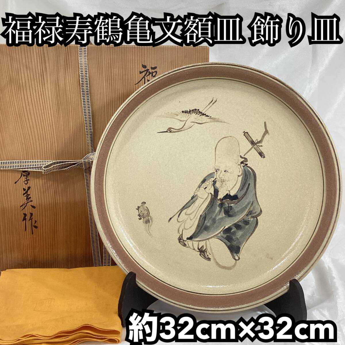 > 厚美作 益子焼 福禄寿鶴亀文額皿 飾り皿 約32cm×32cm×5cm 寿老人 鶴亀 柄 吉祥文 長寿 お祝い縁起物 お祝い 記念品 【H1895】