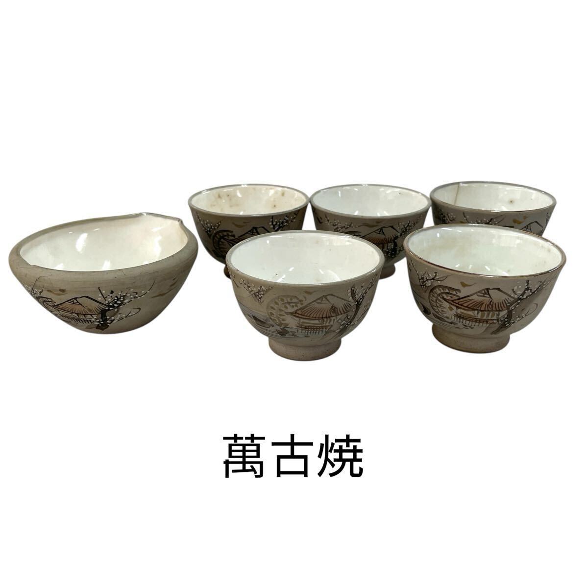 - 萬古焼 煎茶器揃 6点 色絵 茶道具 煎茶碗 湯冷まし 湯呑み 煎茶道具 陶磁器 茶器 【高さ約4.5㎝】 #0602-055A1