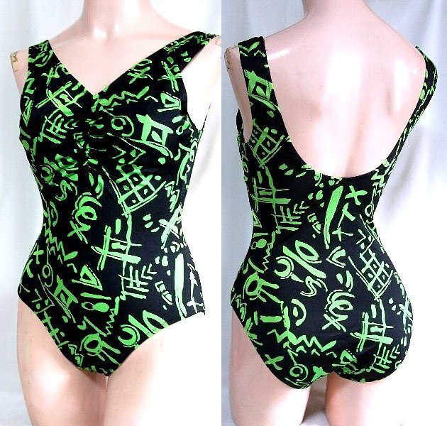 - ★☆蛍光グリーン模様入り黒ワンピース水着☆★