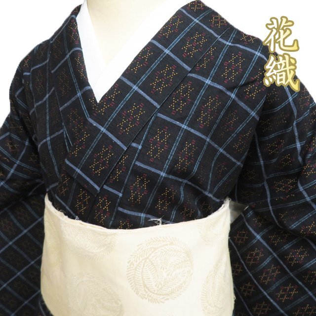 > 特選 琉球 花織 小紋 着物 中古 正絹 紬地 袷 カジュアル 長格子模様 黒色 多色 身丈170.5cm 裄69.5cm L トール きもの北條 A1283-1