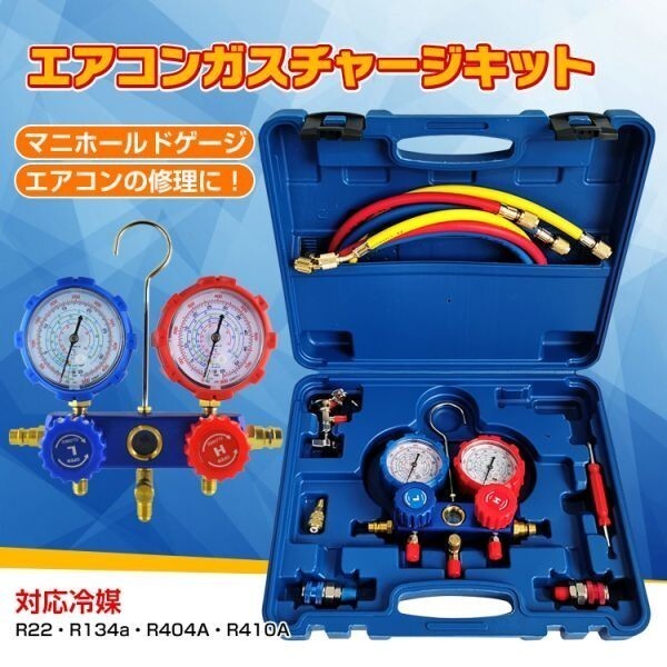 > エアコンガスチャージキット マニホールドゲージ 対応冷媒 R22 R134a R404A R410A チャージングホース 缶切りバルブ ee231