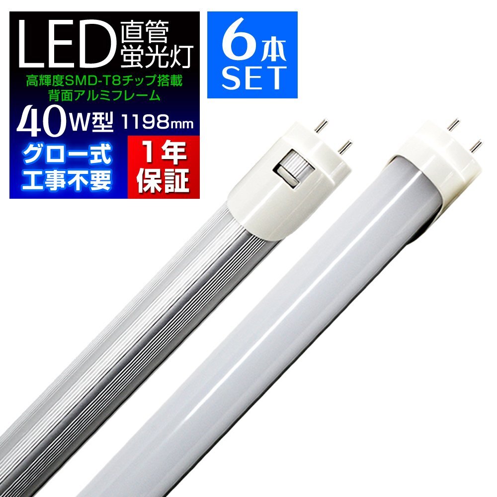 - 【6本セット】1年保証付き LED蛍光灯 昼光色 40W型 1198mm 約120cm 直管 LEDライト SMD グロー式 工事不要 照明 店舗 オフィス 省エネ