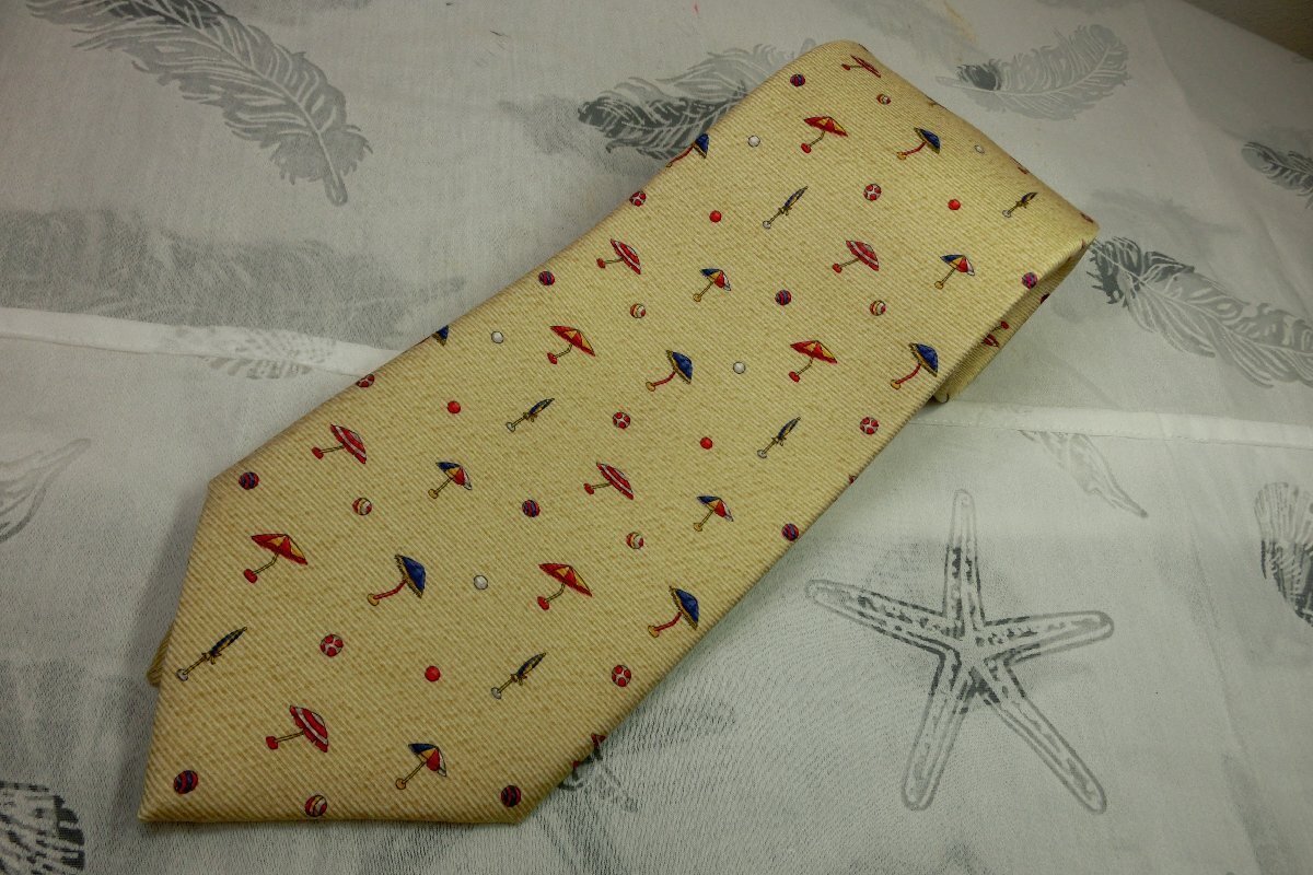 > ♪美品 イタリー製(正規品)★BVLGARI/ブルガリ★イエロー地・ピーチパラソル柄セタシルクネクタイ Handmade in Italy
