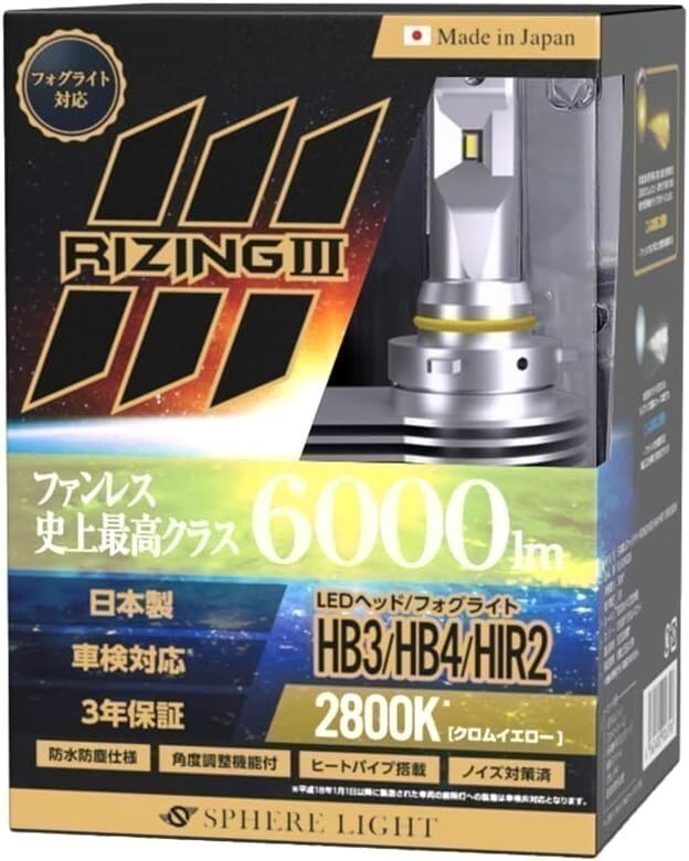 - 3年保証 スフィアライト ライジング3 RIZING3 HB3/HB4 12V用 2800K ファンレス 日本製 LED ヘッドライト 6000lm 車検対応 SLRZHB028