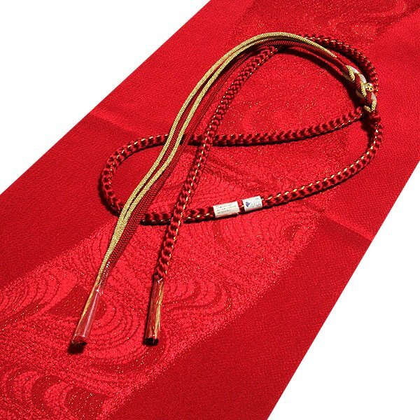 - [和楽屋] ■「振袖用 正絹」煌びやかな金糸 流水地紋 赤色系 上質なちりめん生地 帯揚げ 飾りつき 丸組 帯締め セット■【メール便OK】