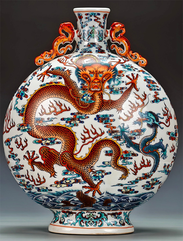 > yfa|0248 中国磁器 陶芸 磁器『【大清乾隆制】パステル「蒼龍教子」竜耳抱月瓶です』施釉陶 古代工芸品 陶芸 精美彫 置物 收藏品