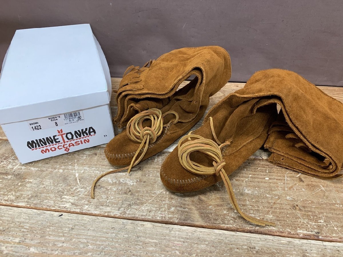 - 【YJ-0769】未使用 箱付 MINNETONKA ミネトンカ MOCCASIN モカシン 1段フリンジ ブーツ サイズ8 ブラウン系 東京引取可【千円市場】