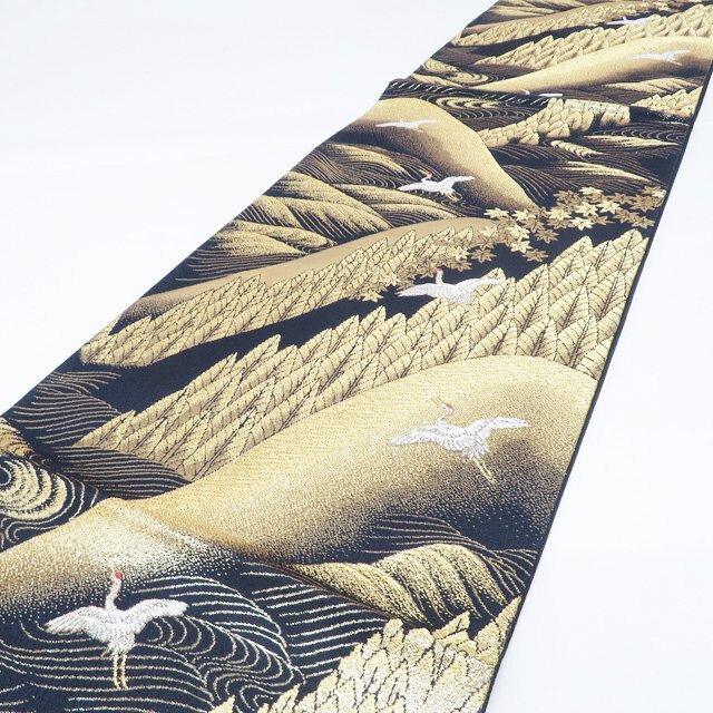 - ★きもの北條★ 波文 木々に鶴の図 六通 箔糸 仕立て上がり 中古 正絹 袋帯 T804-2