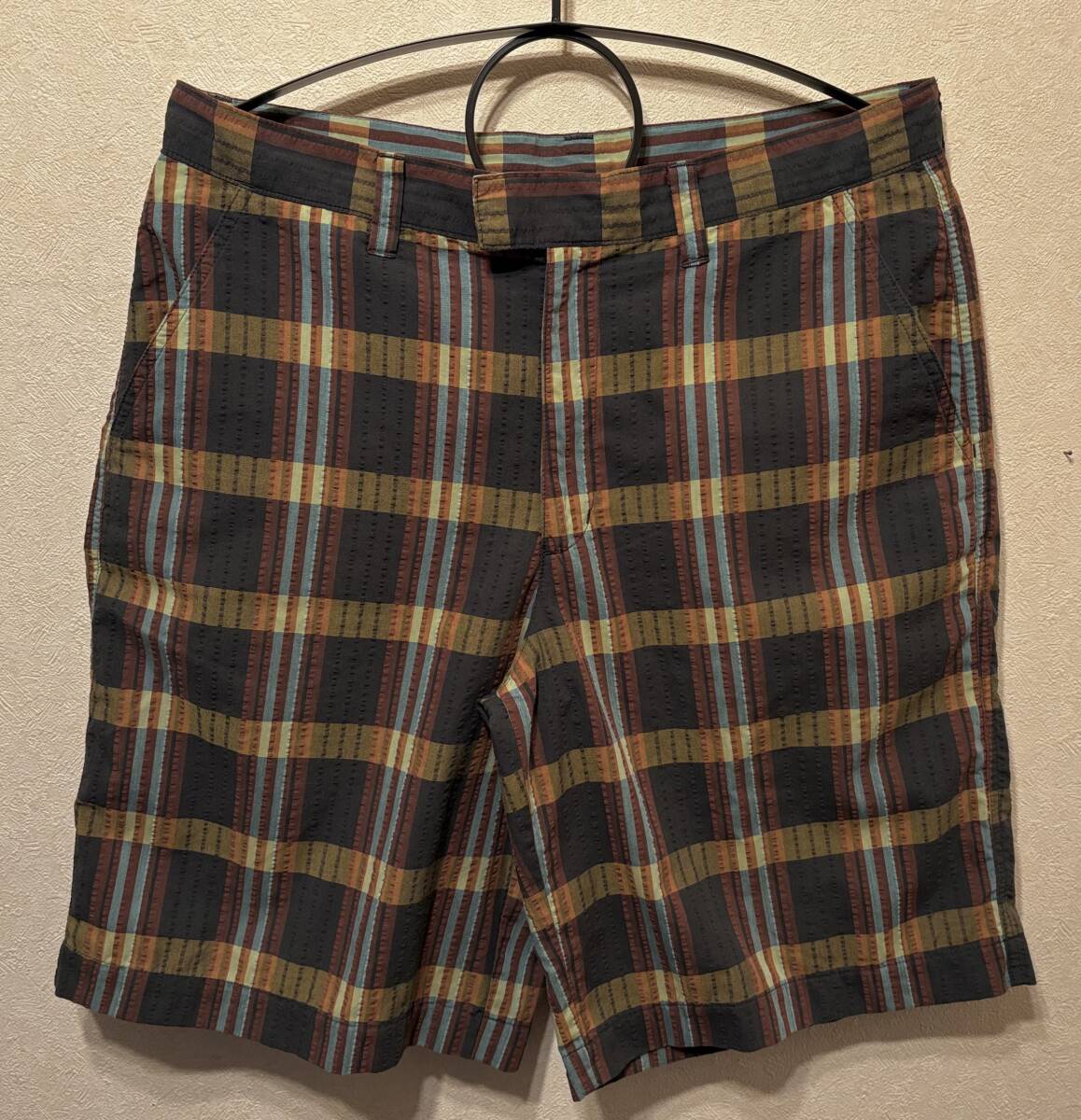 > オーガニックコットンLパタゴニアpatagoniaショーツ32ダークグレー墨黒サックス赤茶シアサッカー好配色マドラスチェック柄シャツ地オールド