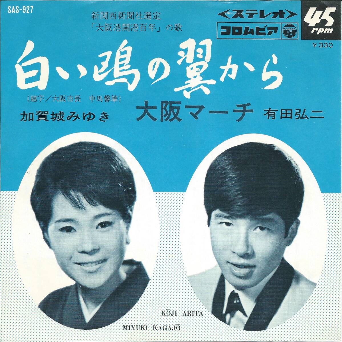 - 7inch/SAS-927/白い鴎の翼から/大阪マーチ/加賀城みゆき/有田弘二/新関西新聞社選定「大阪港開港百年」の歌/